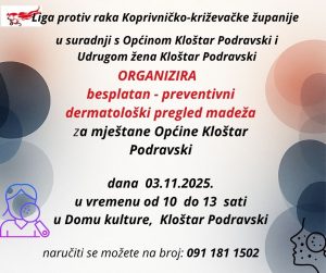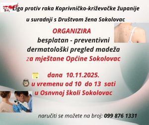 Novi besplatni preventivni dermatološki pregledi će se održati 10. studenoga 2025. godine u vremenu od 10:00 do 13:00 sati u prostorijama Osnovne škole Sokolovac.